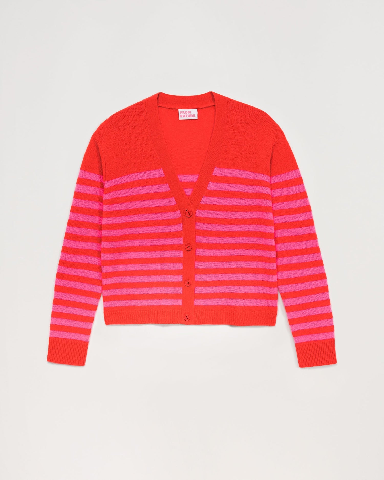 Cardigan Court Rayures 2 Fils - 100% Cachemire - Rouge vif