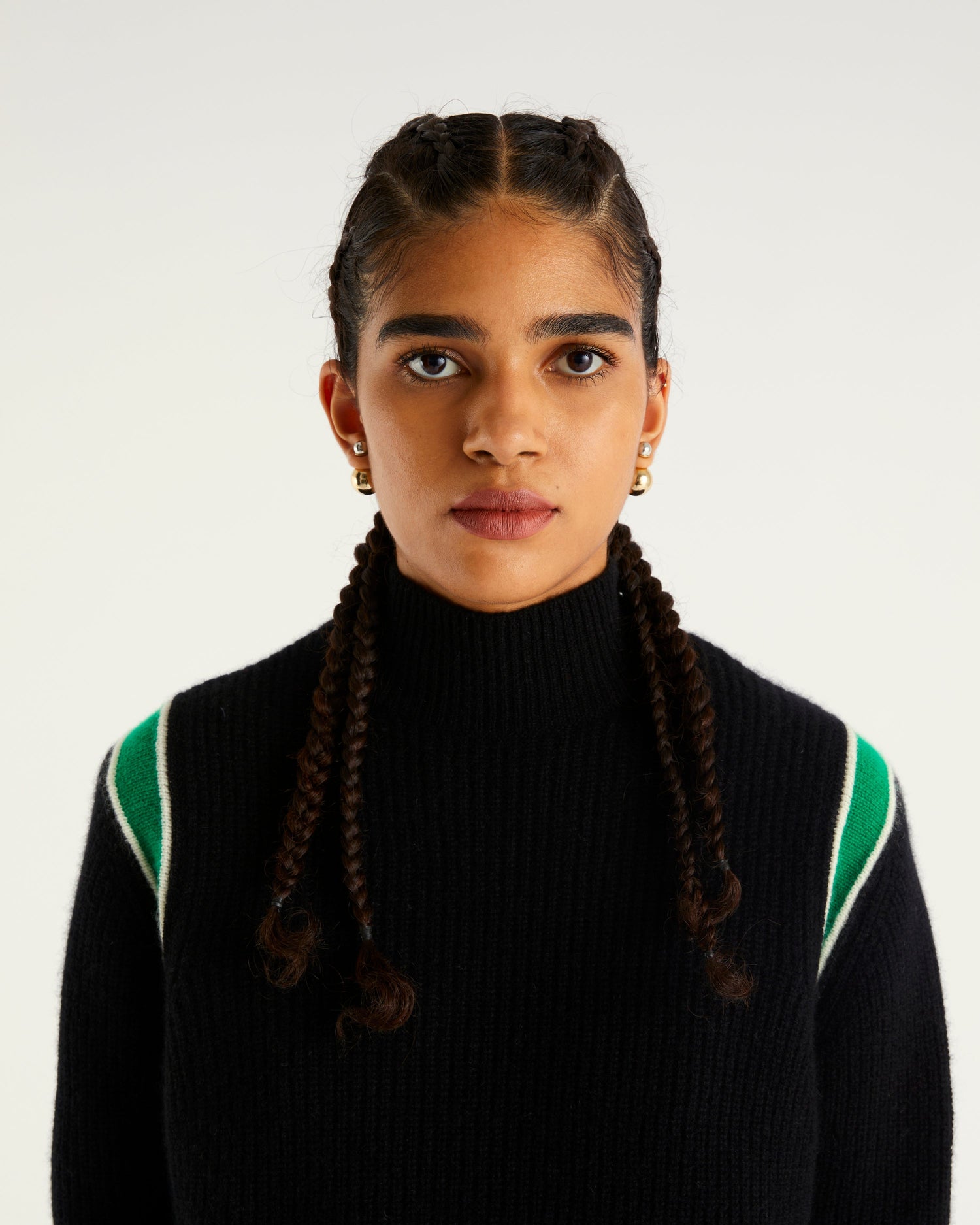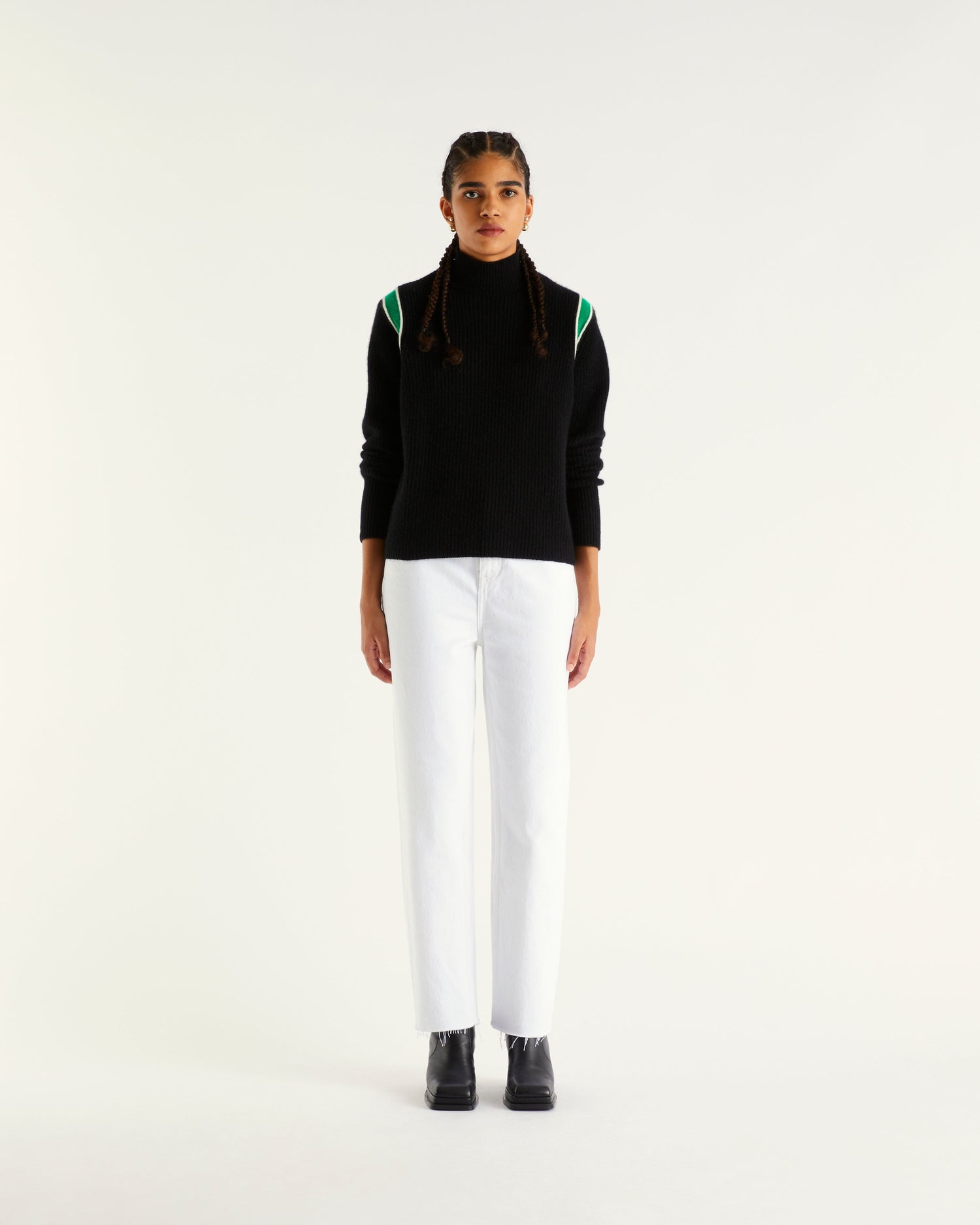 Sweater Col Montant Court Maille Perlée Bande 4 Fils - 100% Cachemire - Noir
