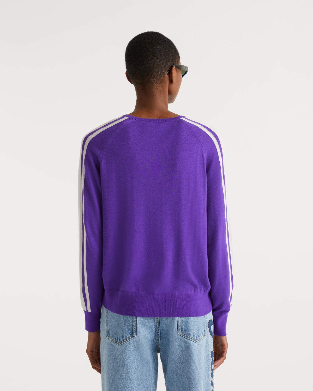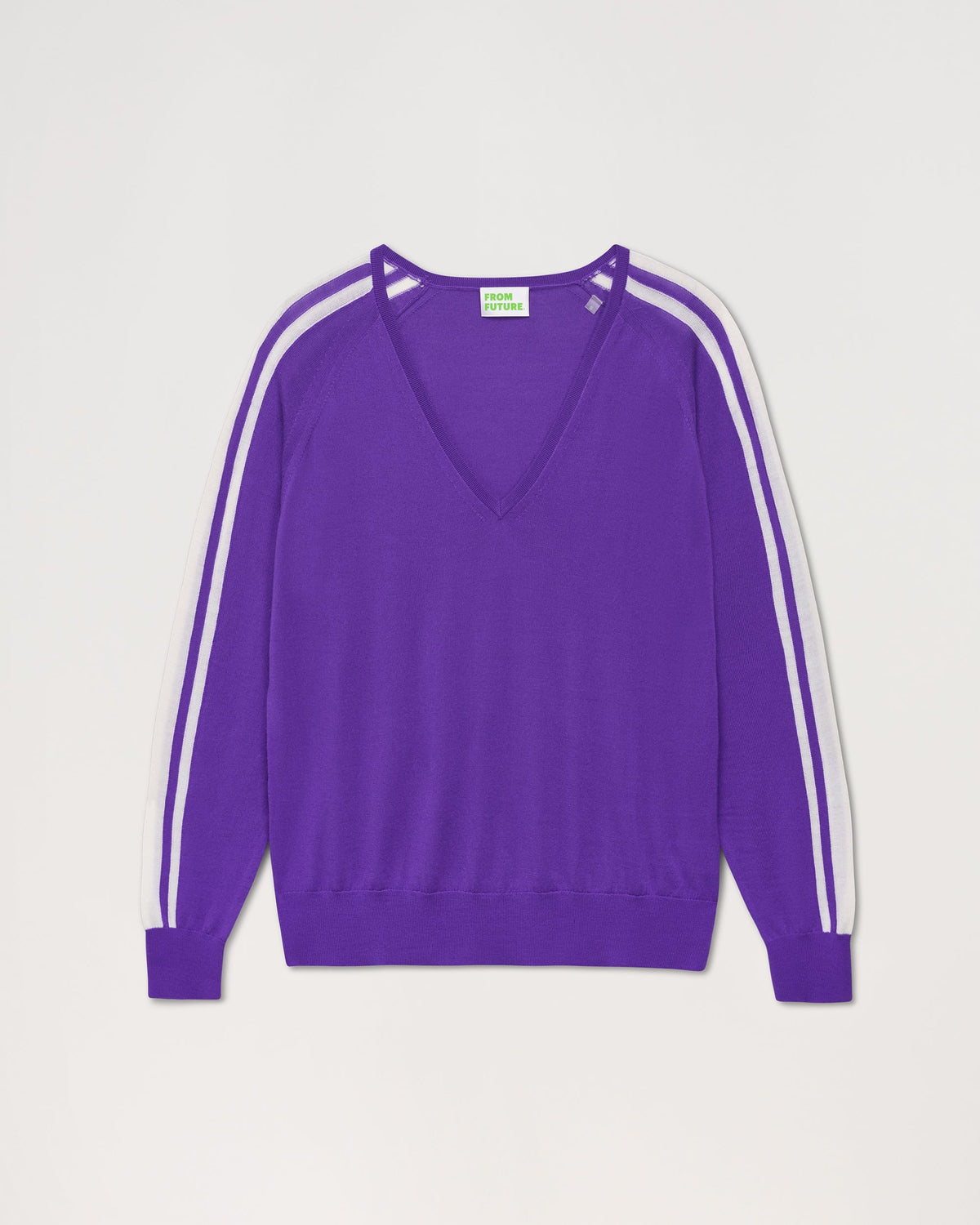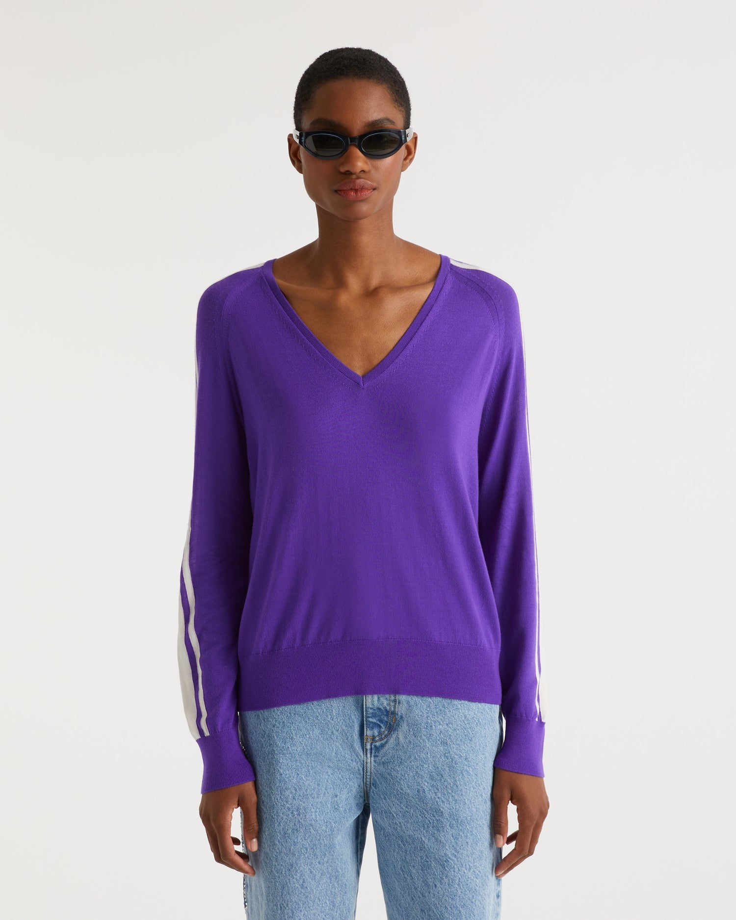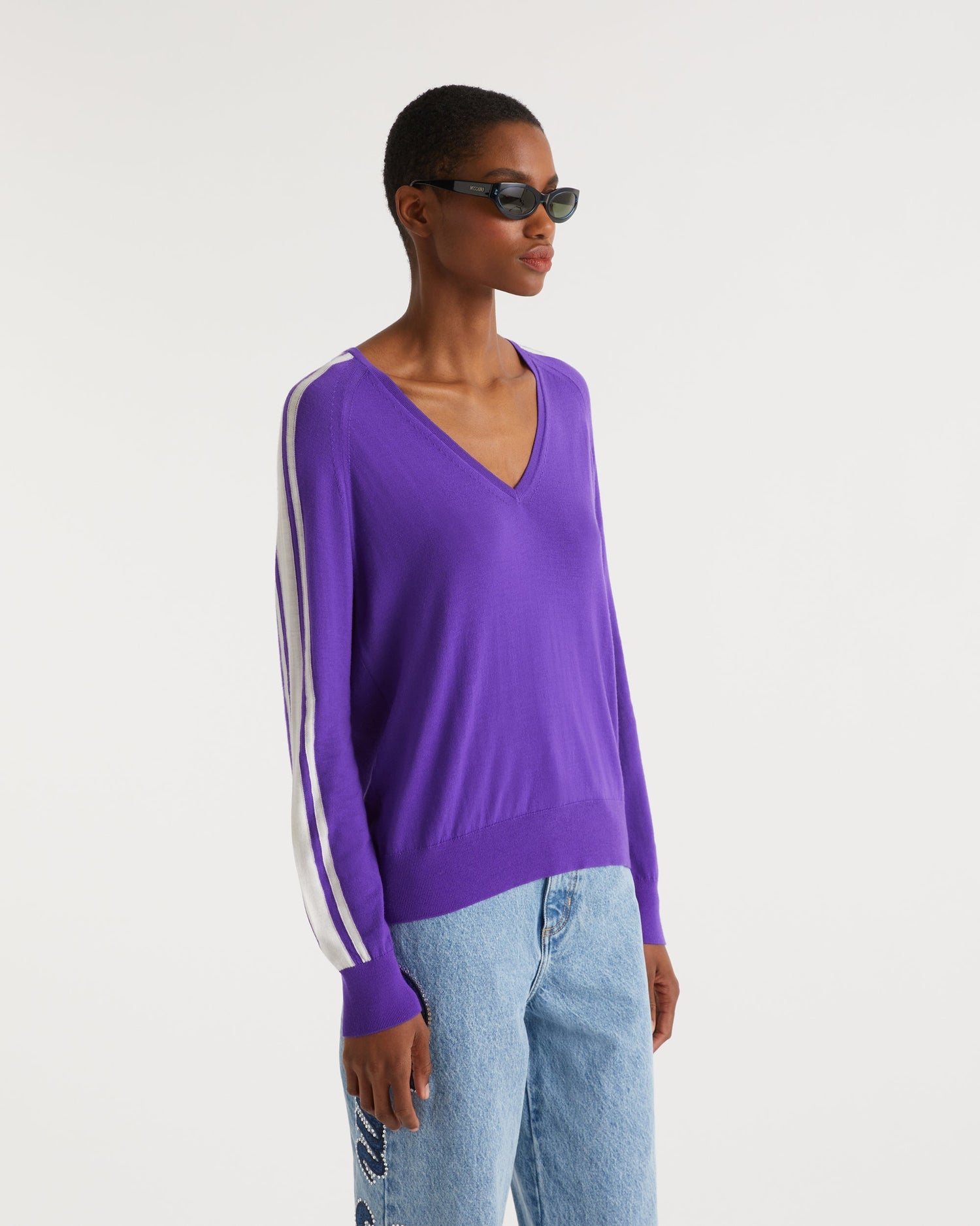 Sweater Pull Col V Oversize Bandes Manches - Laine Mérinos - Violet fluo